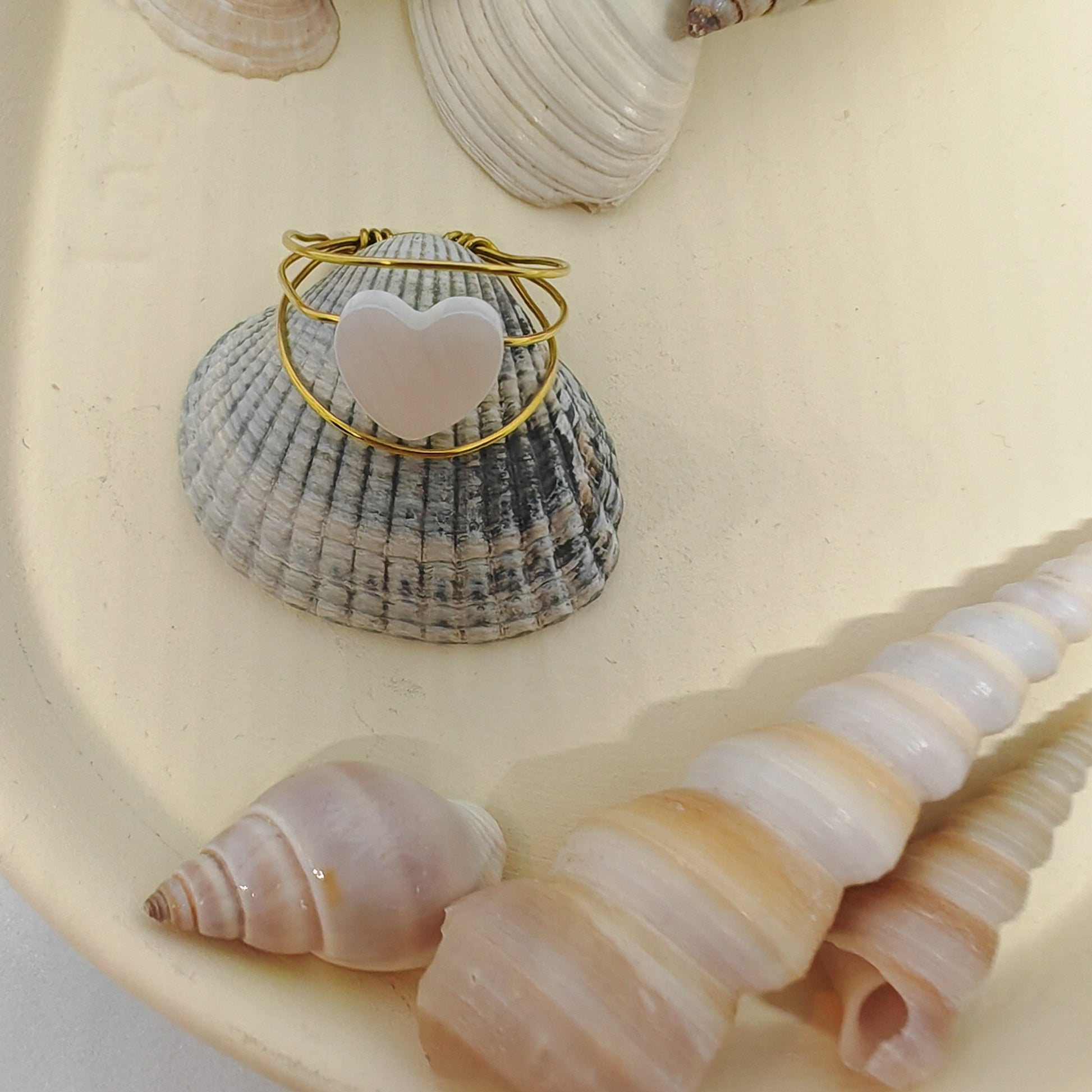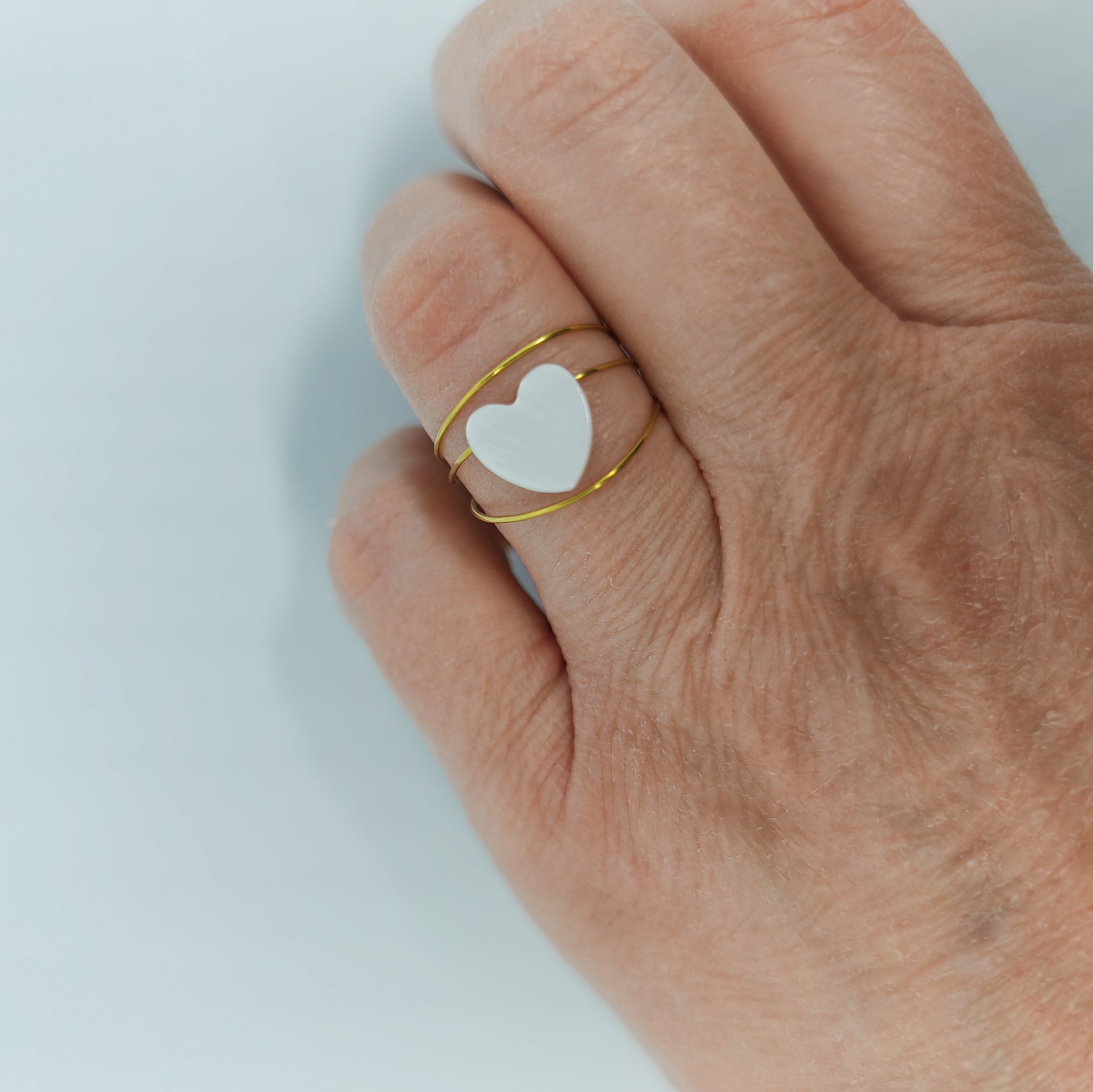 - Bague fine 3 rangs, doré, ornée de perles de nacre en forme de cœur.
